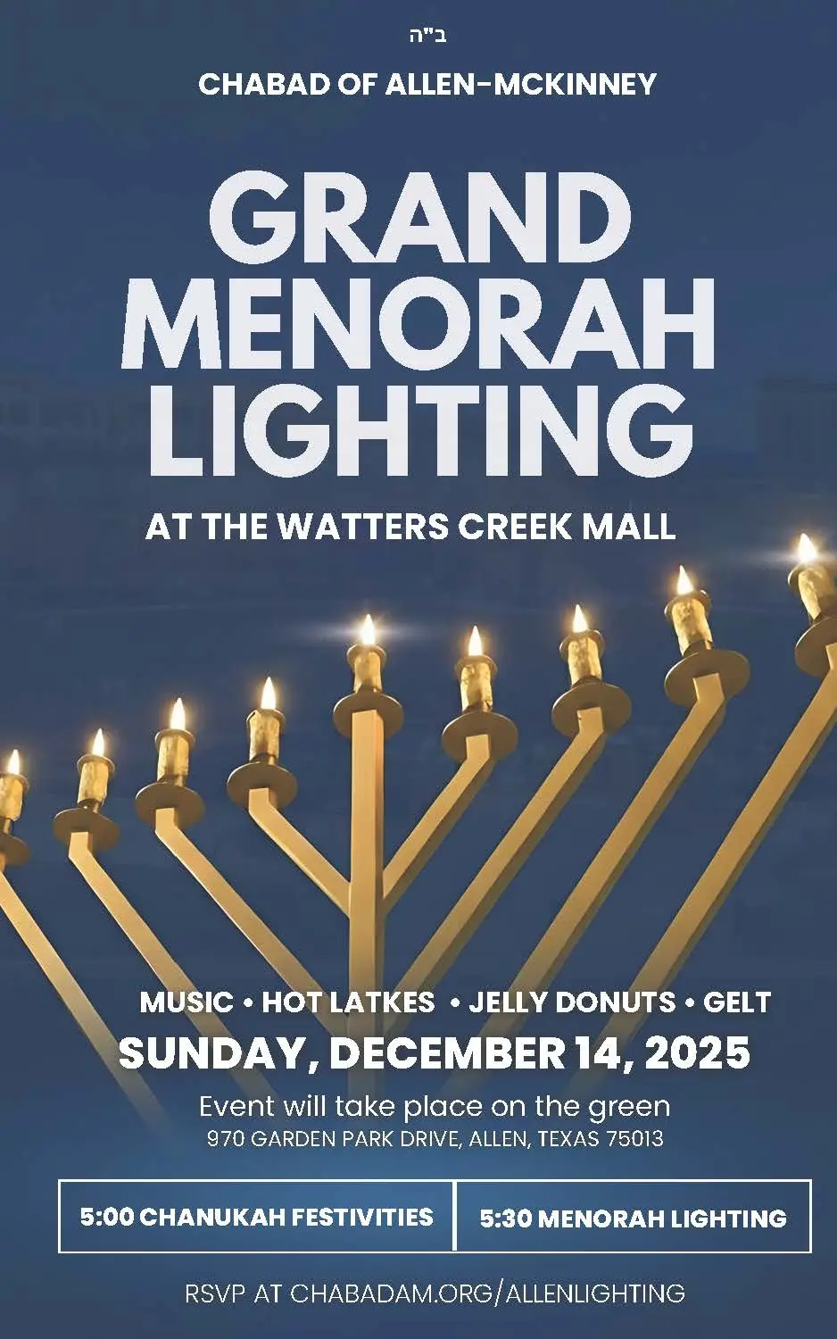 Join us for the annual Chanukah Menorah Lighting at Watters Creek Mall! Enjoy delicious latkes and donuts, fun arts and crafts for the kids, and a beautiful public lighting of the Menorah on The Green. The celebration will also feature an incredible bubble show and a super fun 360° video experience to capture the moment. A warm and festive event for the whole community—don’t miss it!